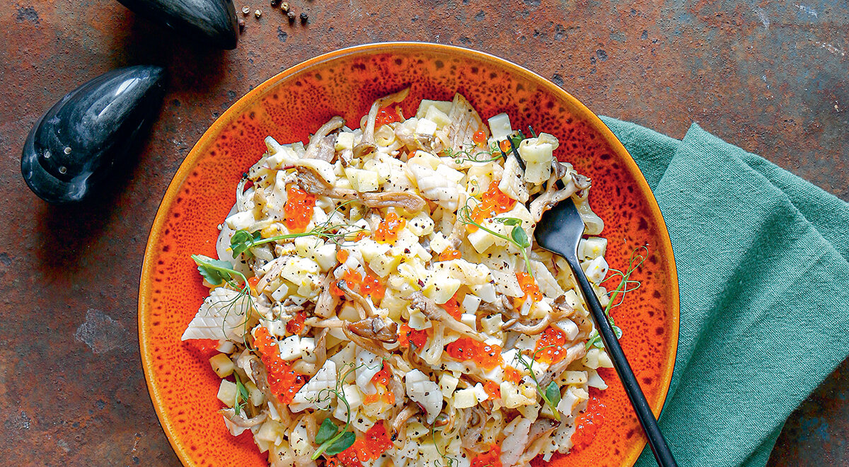 - Салатов — свежий, нарезанный кальмар отлично сочетается с овощами и соусами;