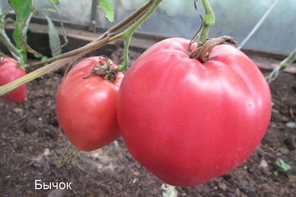 - Розовый Бычок: плоды малинового оттенка, сердцевидной формы, весом от 200 до 400 граммов, мясистые с сладким вкусом.