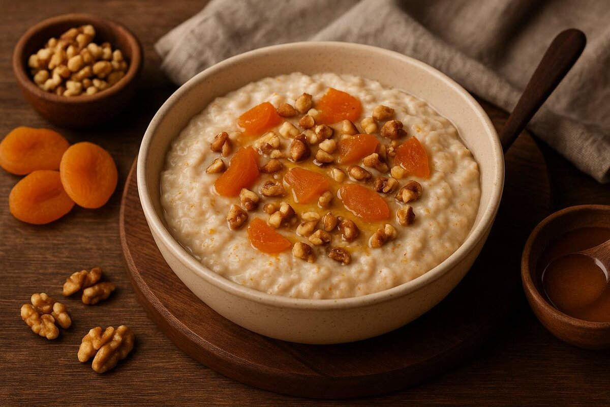 3. Объединяем вкусы: Как только каша будет почти готова, добавьте нарезанную курагу и часть орехов. Перемешайте и оставьте под крышкой на 5-7 минут. Это даст возможность кураге отдать свою сладость, а каше — впитать ароматы.