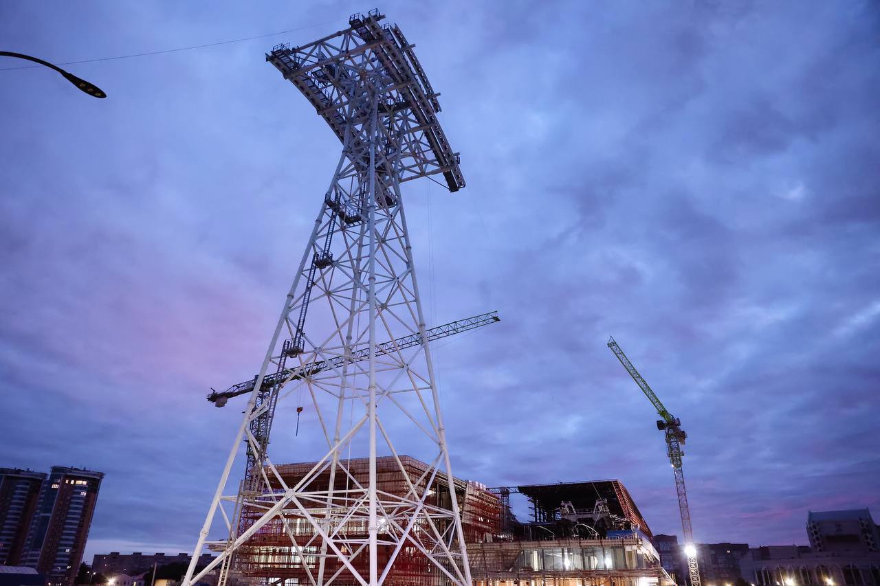 На объекте уже установлены четыре несущих каната диаметром 45 мм и один основной канат диаметром 64 мм. Опоры канатной дороги полностью смонтированы и прошли проверку на прочность.