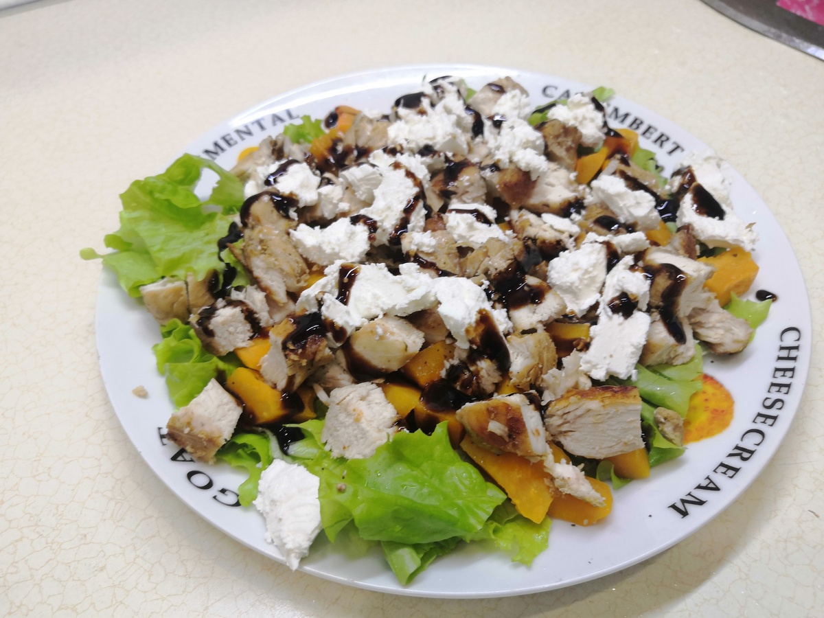Финишным аккордом будет нарезка сыра фета, который добавляют поверх курицы. Блюдо поливается бальзамическим соусом, но можно экспериментировать с другой заправкой: смесью масла, горчицы и лимонного сока. Однако стоит помнить, что в таком случае калорийность салата изменится.
