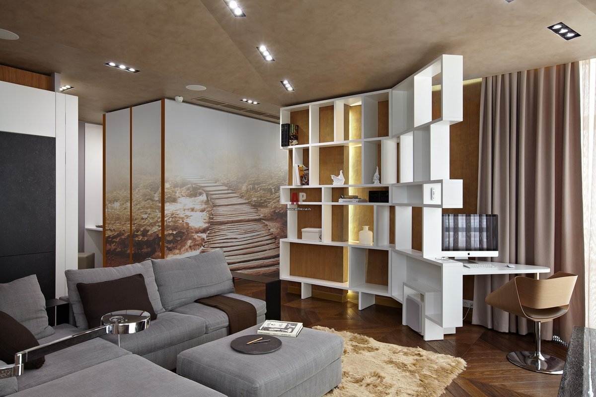 Одно из ключевых решений в обустройстве – зонирование пространства. Для этого можно использовать правильно подобранную мебель, а также так называемые «зональные» коврики – каждый отдельный участок будет выделен благодаря своему покрытию. Обязательно стоит сначала спланировать расположение предметов, а затем приступить к реализации задуманного.