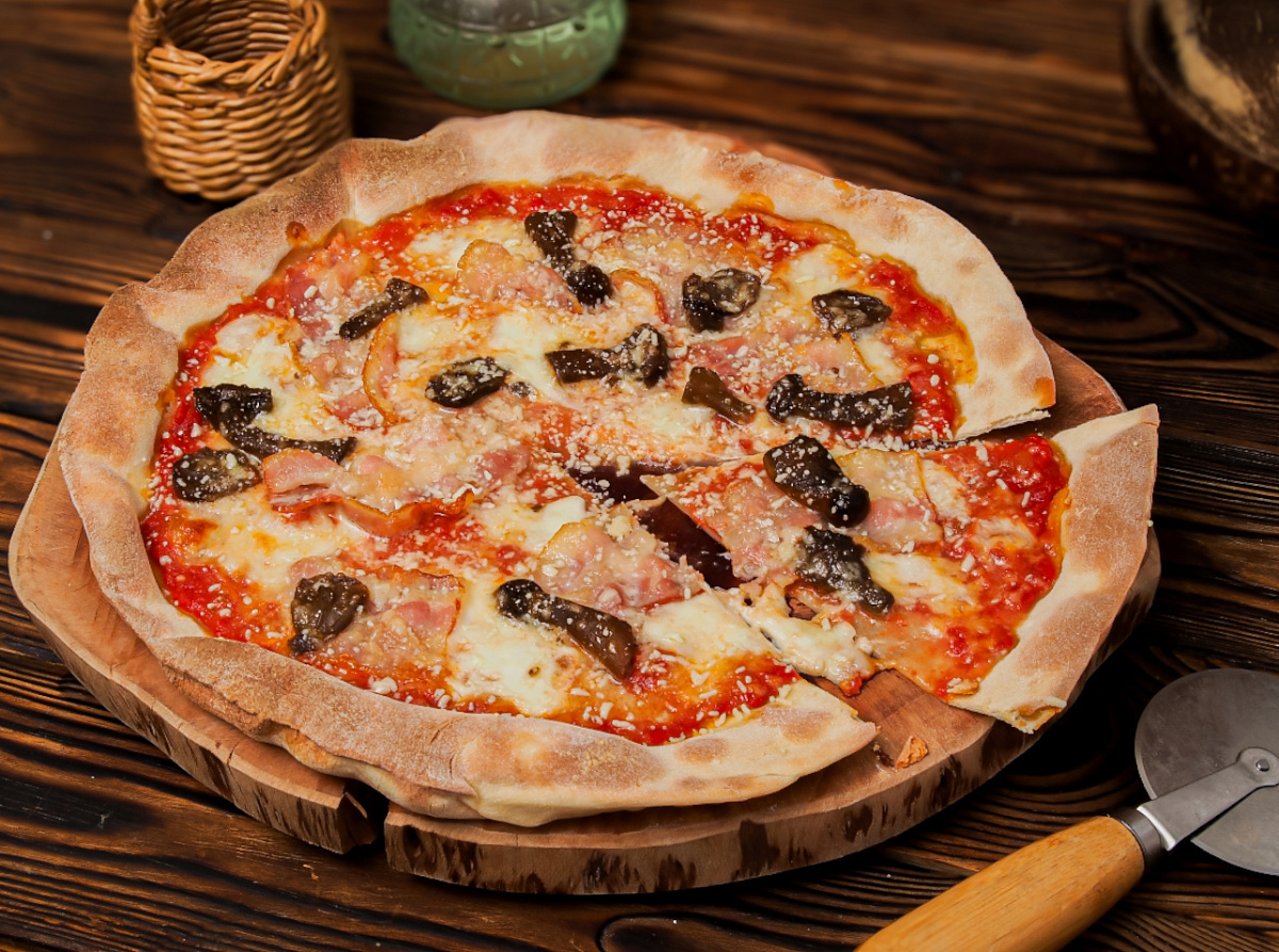 Шаг 2. Разведите гурманскую гамму вкусов: моцареллу ломтики, бекон и опята — на тесте. Выпекайте 5–7 минут, ориентируясь по своей духовке — главное не пересушить основу.