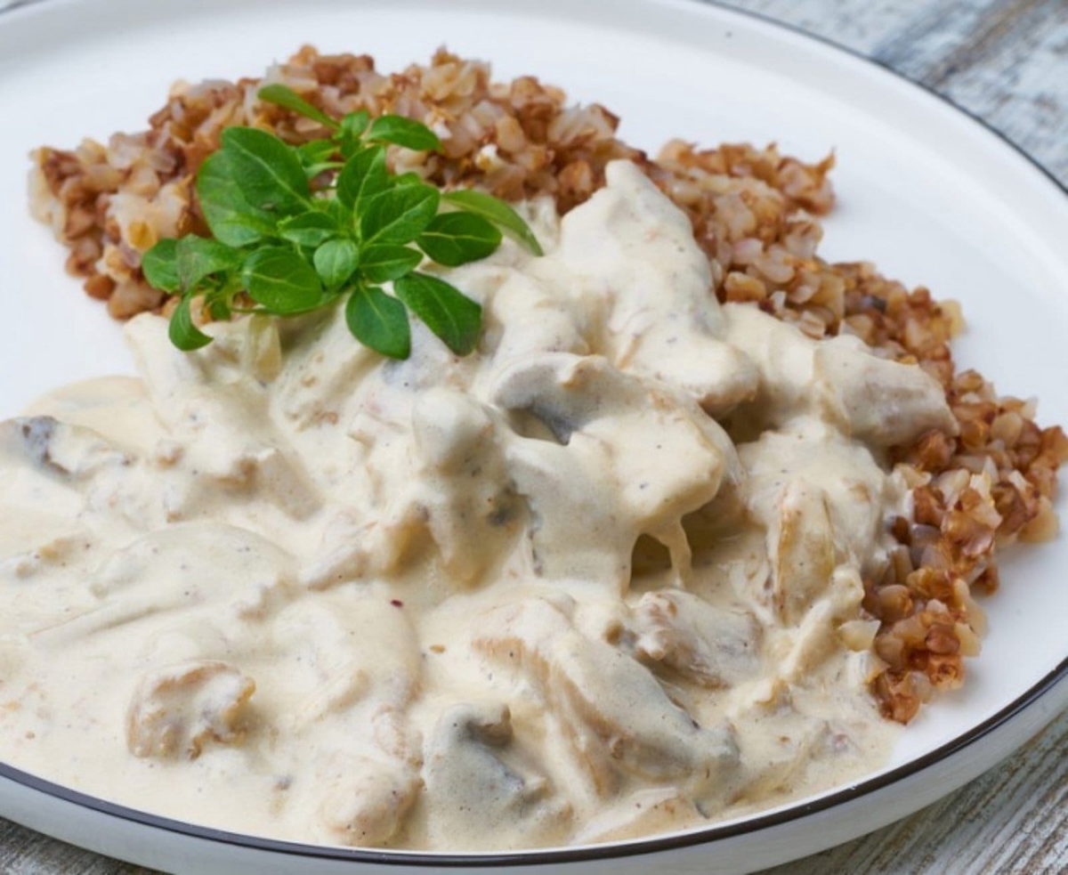 Сначала поджаривается курица до золотистой корочки, затем в той же сковороде прогреваются грибы и лук. Соединяем ингредиенты, вводим сметанный соус и легонько прогреваем до единой текстуры. Гречку доводим до готовности отдельно, раскладываем по тарелкам и польём соусом сверху, украшая зеленью.