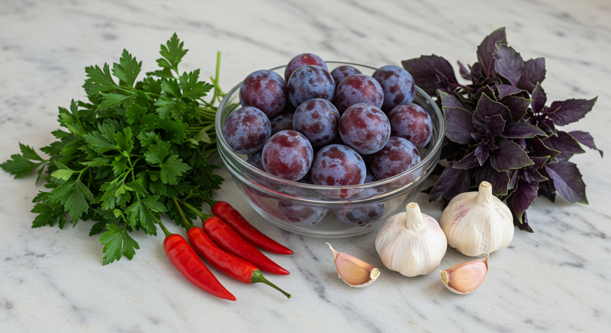 Ингредиенты на 15 порций: сливы, зелень (петрушка, базилик), чеснок, острый перец по вкусу, хмели-сунели, соль и сахар. Варианты гибкие: алыча и другие кислые сливы подойдут, важно не переговорить баланс вкусов и сохранить характер соуса.