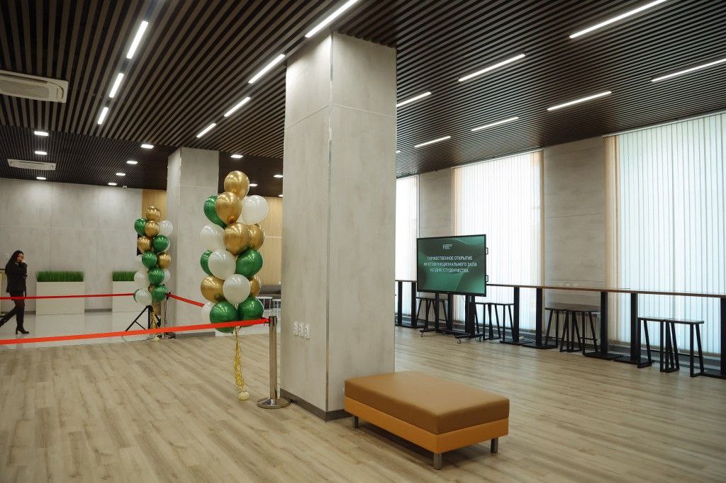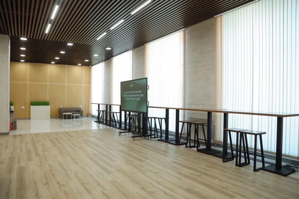 Это модульное помещение, которое можно трансформировать для проведения деловых, образовательных и развлекательных мероприятий. Зал расположен на первом этаже главного корпуса. В нем студенты смогут заниматься между парами, собираться на мозговые штурмы или просто попить кофе. В летнее время здесь будет находиться и приёмная комиссия.