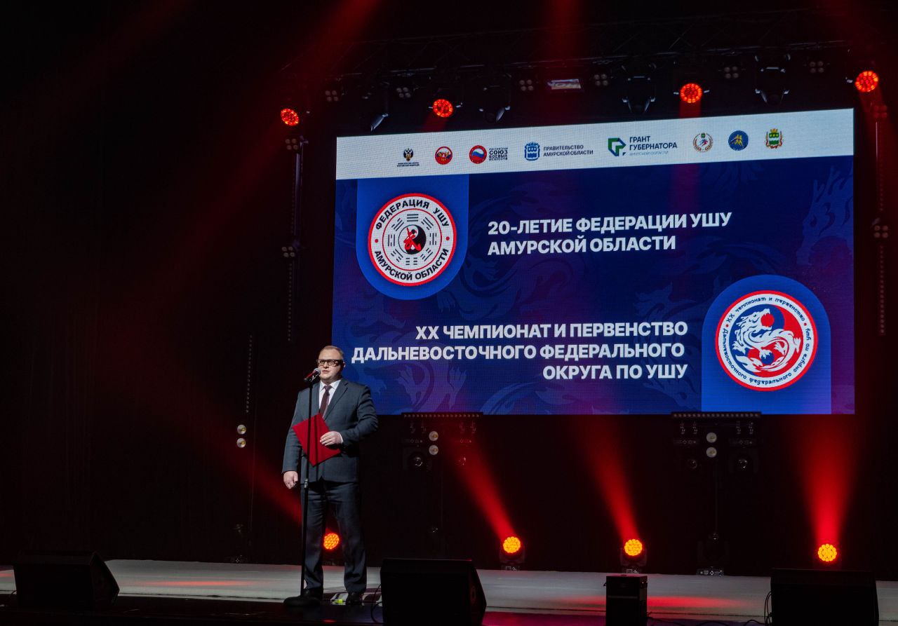 Сегодня, 31 января, в Амурской областной филармонии состоялось торжественное мероприятие, посвященное 20-летию Федерации Ушу Амурской области и ХХ чемпионату Дальневосточного федерального округа по ушу. Тренеров и спортсменов федерации поздравил исполняющий обязанности председателя Законодательного Собрания Амурской области Евгений Тюхаев.