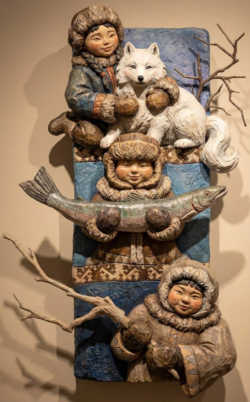 Его главные герои — эвенкийские дети, рассказывающие о традиционных промыслах своего народа. Девочка помогает в разведении собак, а мальчики ловят рыбу и пасут оленей. В центре композиции — эвенкийская пословица: «Олра мв аявран, орат — нлтэм» — «Рыба любит воду, трава — солнце».