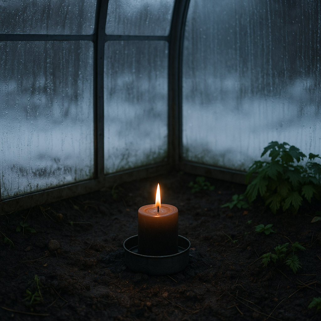Свеча, расположенная в теплице, не просто обогревает пространство — она действует как индикатор влажности и стабилизатор температуры. Горючее пламя не дает холодному воздуху заполнять теплицу, а выделяемое тепло смещает точку росы, предотвращая образование инея и конденсата на растениях.