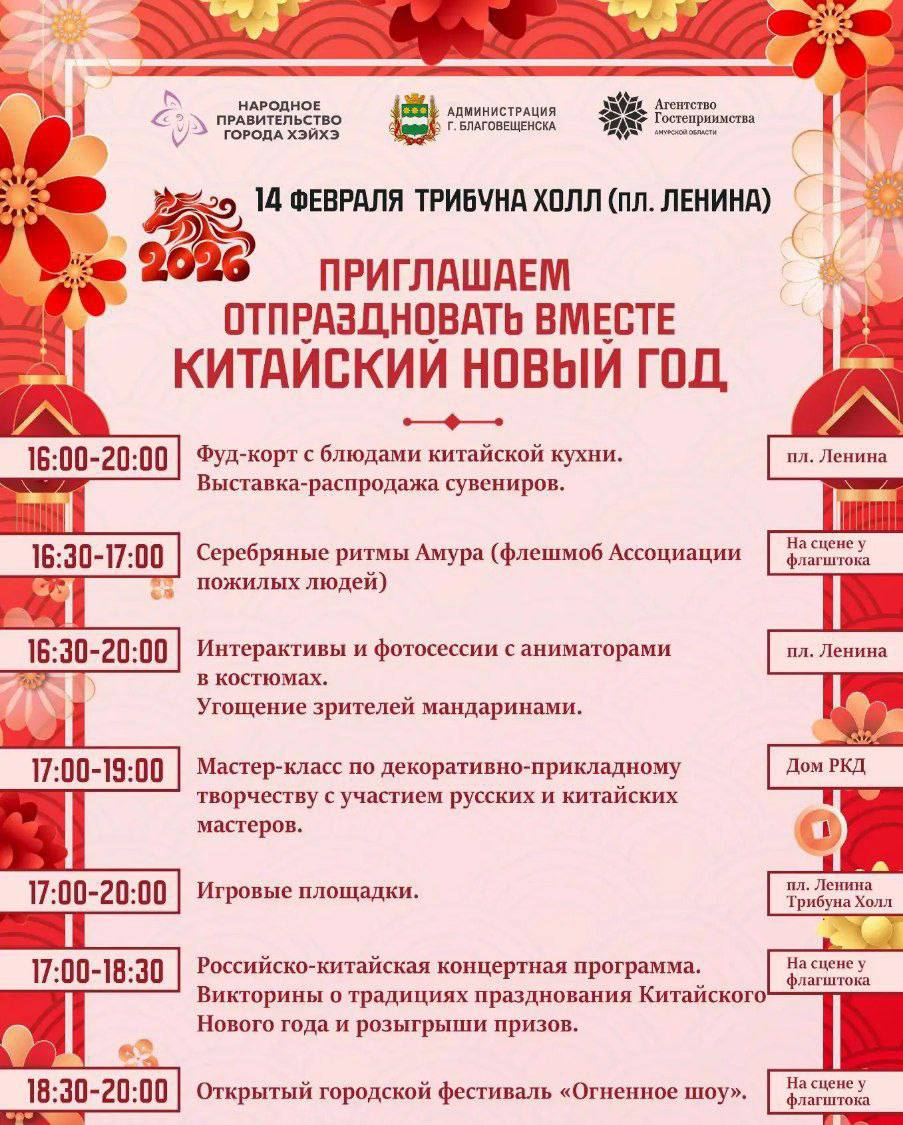 С 13 по 15 февраля мероприятия пройдут в библиотеках, Домах культуры, Доме российско-китайской дружбы, на площади Ленина, в районе «Трибуны Холл» и возле самой большой на Дальнем Востоке тюбинговой горки.