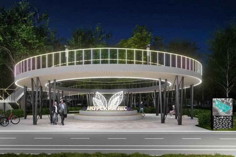 В глубине парка расположатся амурозавр, прогулочные маршруты, в том числе поднятые над землей, с выходом на консольную смотровую площадку. С нее откроется прямой вид на Амур и китайский берег.