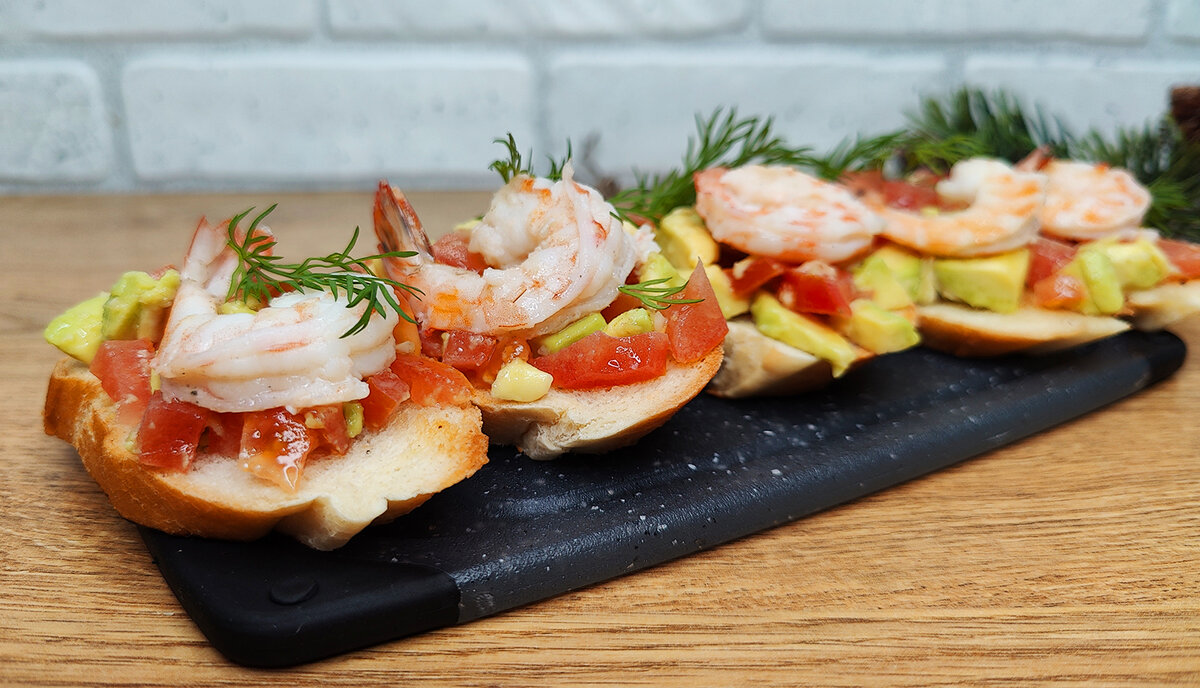 На подготовленные ломтики багета положите овощную смесь, сверху аккуратно выложите обжаренные креветки и украсьте укропом. Вот и готова эффектная и вкусная закуска!