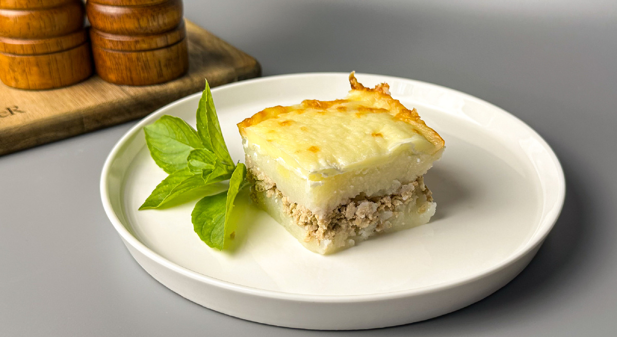 - Собрать запеканку: В смазанную маслом форму положите слой картофельного пюре, затем обжаренный фарш, и снова пюре. Добавьте сверху сметану и посыпьте тертым сыром.