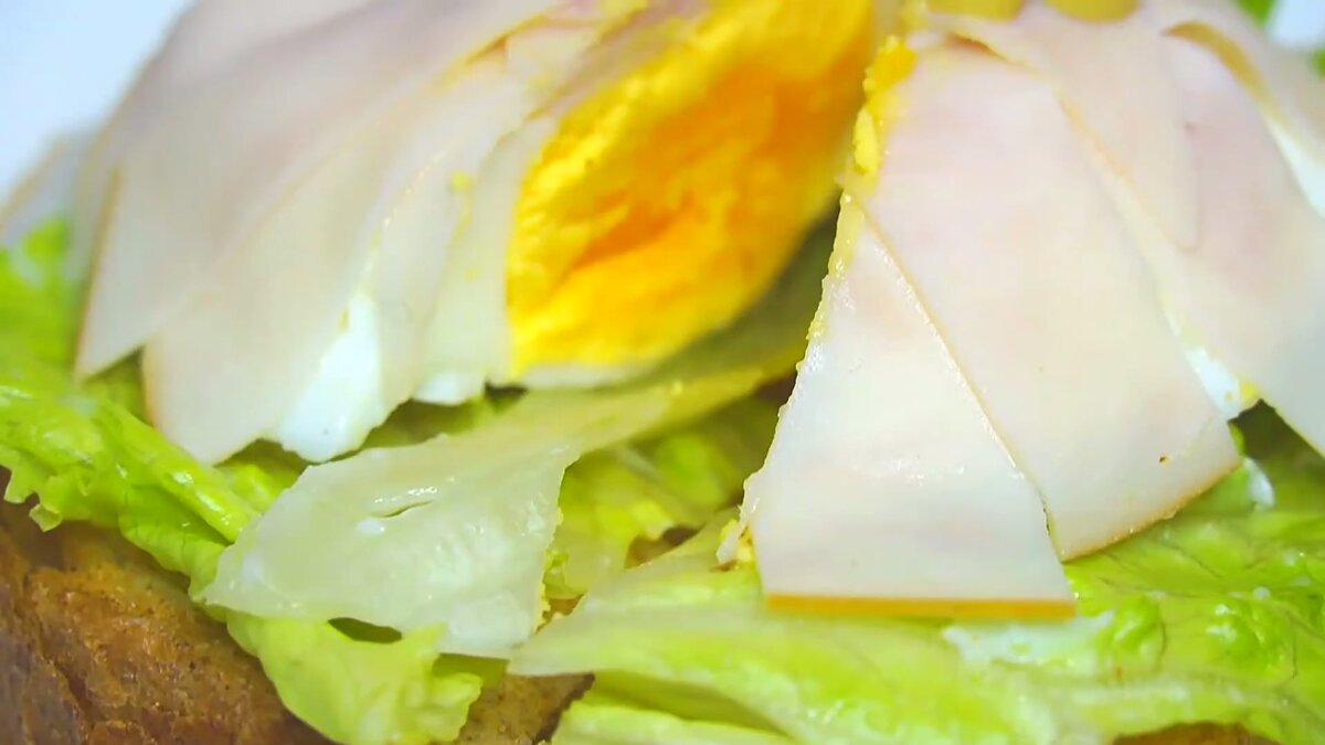 Соберите завтрак: положите яйцо на поджаренный хлеб, добавьте сверху кусочки колбасы и украсьте горчицей. Аппетитный и питательный завтрак готов!