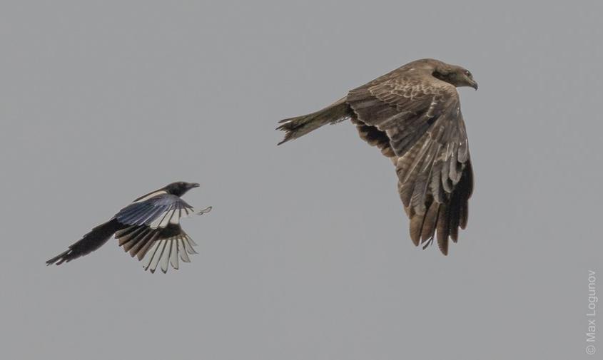 Амурский фотограф-натуралист Максим Логунов показал в своем телеграм-канале, как обычная сорока «загоняла» черного коршуна.
