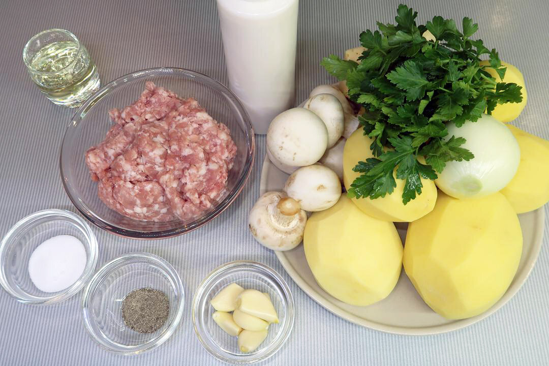 На дно каждого горшочка выложите картофель, а сверху — фрикадельки, обжаренные грибы, петрушку и выдавленный чеснок.