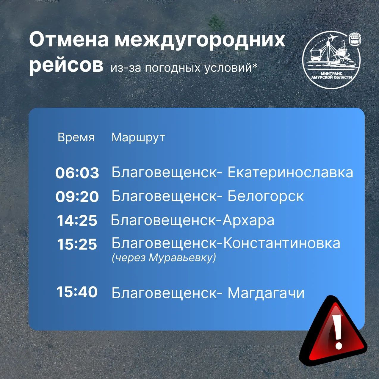 Из-за погодных условий в Амурской области отменили ряд междугородних рейсов. Информацию предоставил региональный Минтранс.