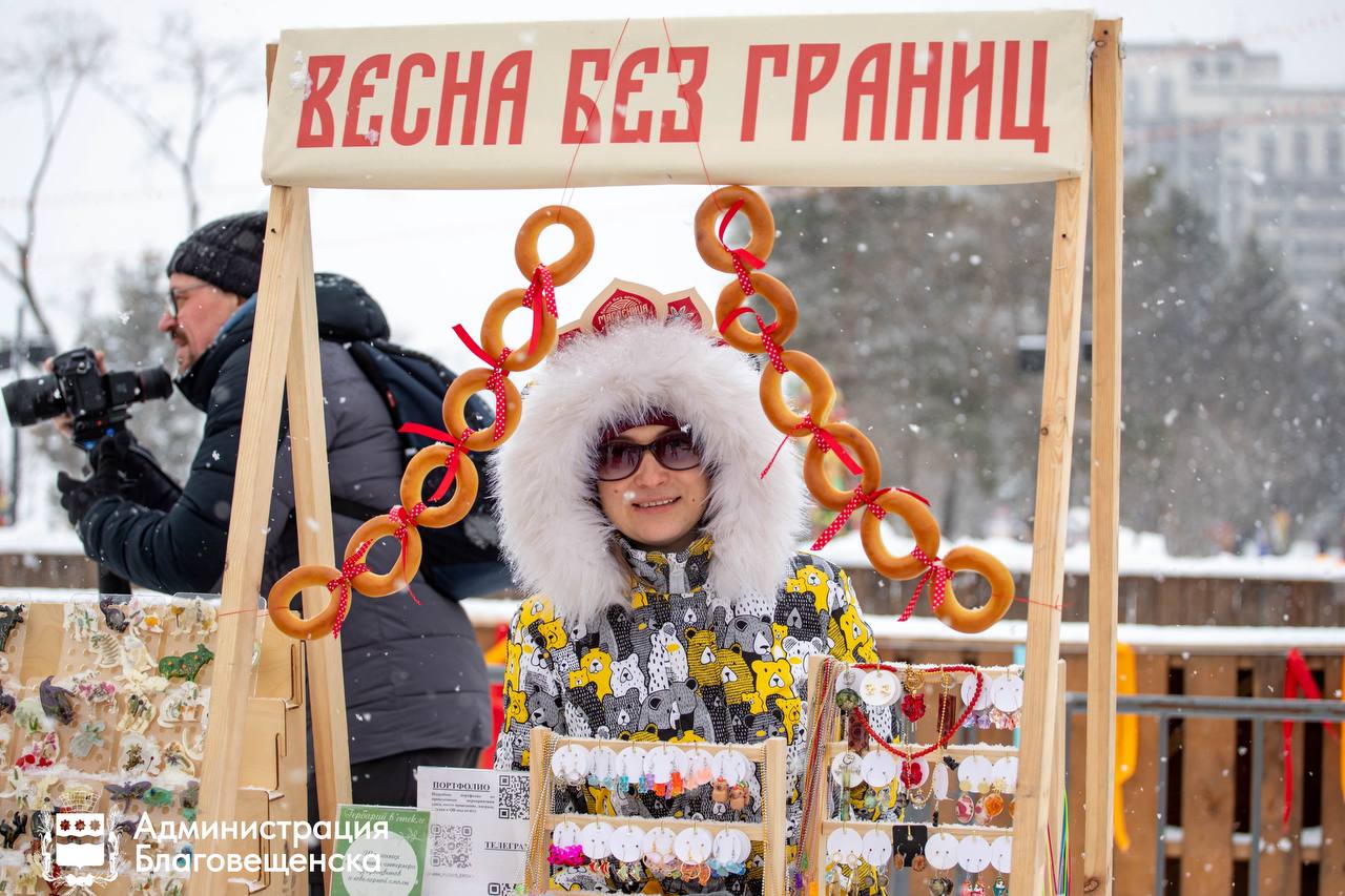 На площади гостей встречала праздничная ярмарка. Благовещенцы и гости города могли купить сувениры, расписать пряники, угоститься щами, пирожками и, конечно, блинами. За время гуляний раздали около 2000 бесплатных блинов.