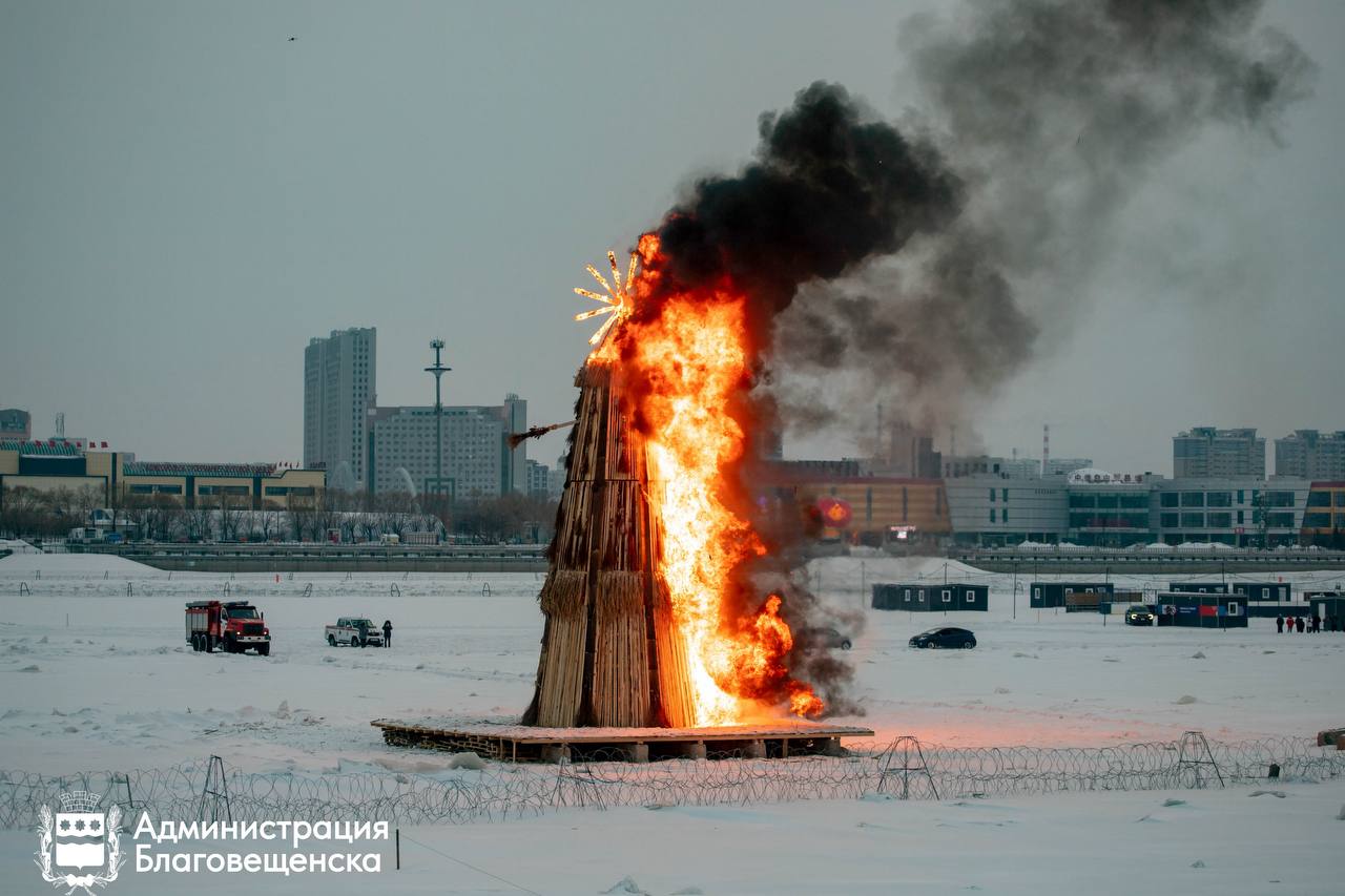 Самым главным событием вечера стало сожжение чучела масленицы на Амуре в районе амфитеатра. Его высота составила 15 метров, а вес — 6 тонн. Для Благовещенска это абсолютный рекорд. Настолько громадного чучела в столице Приамурья ещё не сжигали. Языки пламени были настолько высокими, что их можно было разглядеть и с середины площади Ленина, и с китайского берега Амура. Зрители также могли наблюдала за зрелищем на большом экране у сцены.