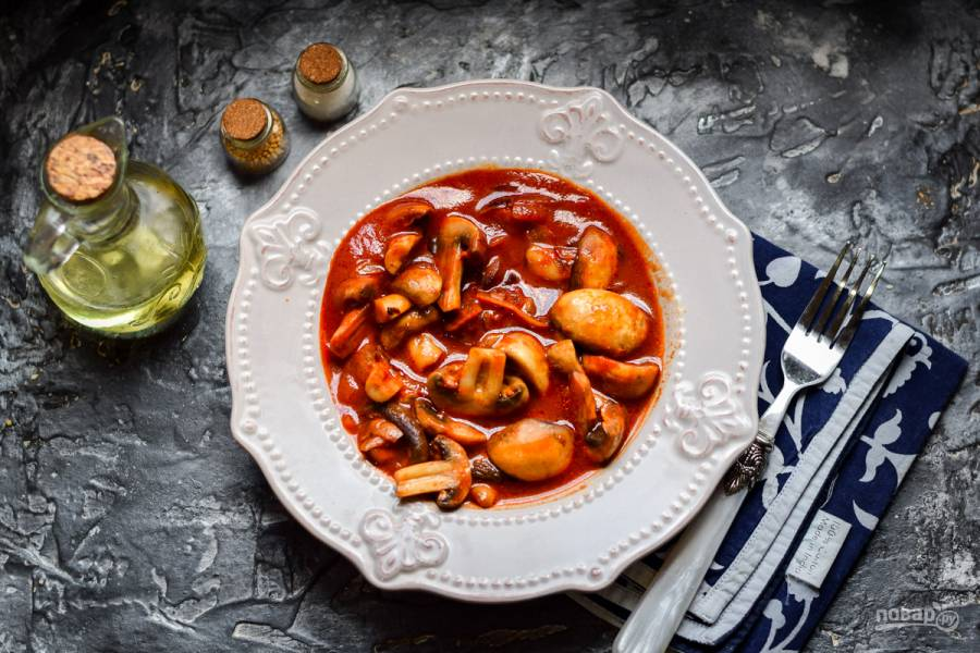 - Насыщенный вкус. Томатный соус придаёт гармоничное сочетание сладости и кислоты, который прекрасно дополняет нежные грибы.