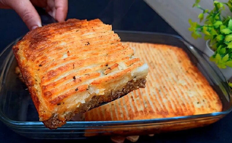 Когда фарш с овощами остынет, в него добавляются яйца, и вся масса тщательно перемешивается. Далее, Фарш выкладывается в форму для выпечки, образуя первый слой, который тщательно разравнивается. Сверху равномерно распределяется картофельное пюре, а на поверхности можно создать узор вилкой.