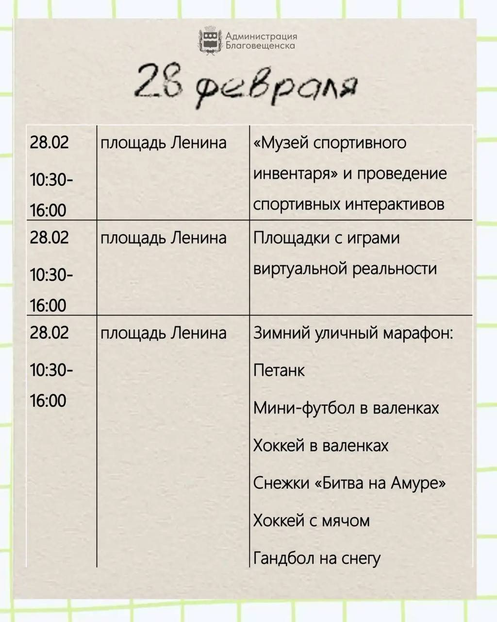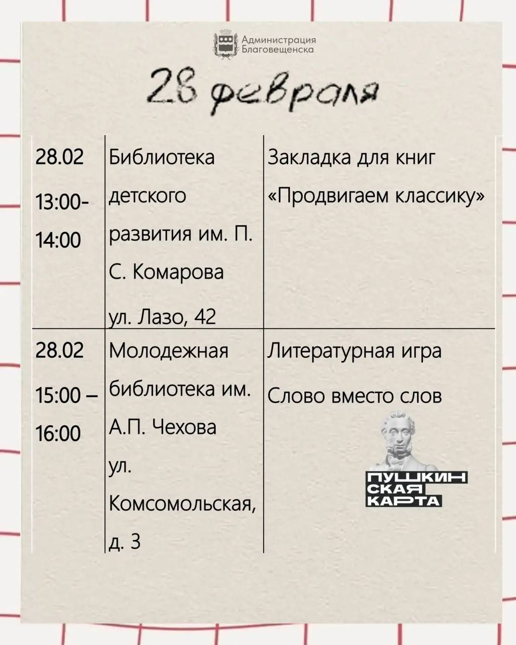 В эти выходные пройдет главное событие сезона — #ЗимФестАмур! Приготовьтесь к насыщенной программе: вас ждут хоккей на льду Амура, захватывающие заезды команды «КамазМастер», яркие тематические площадки на площади Ленина. Также много активностей пройдет в библиотеках города. Некоторые из них по Пушкинской карте.
