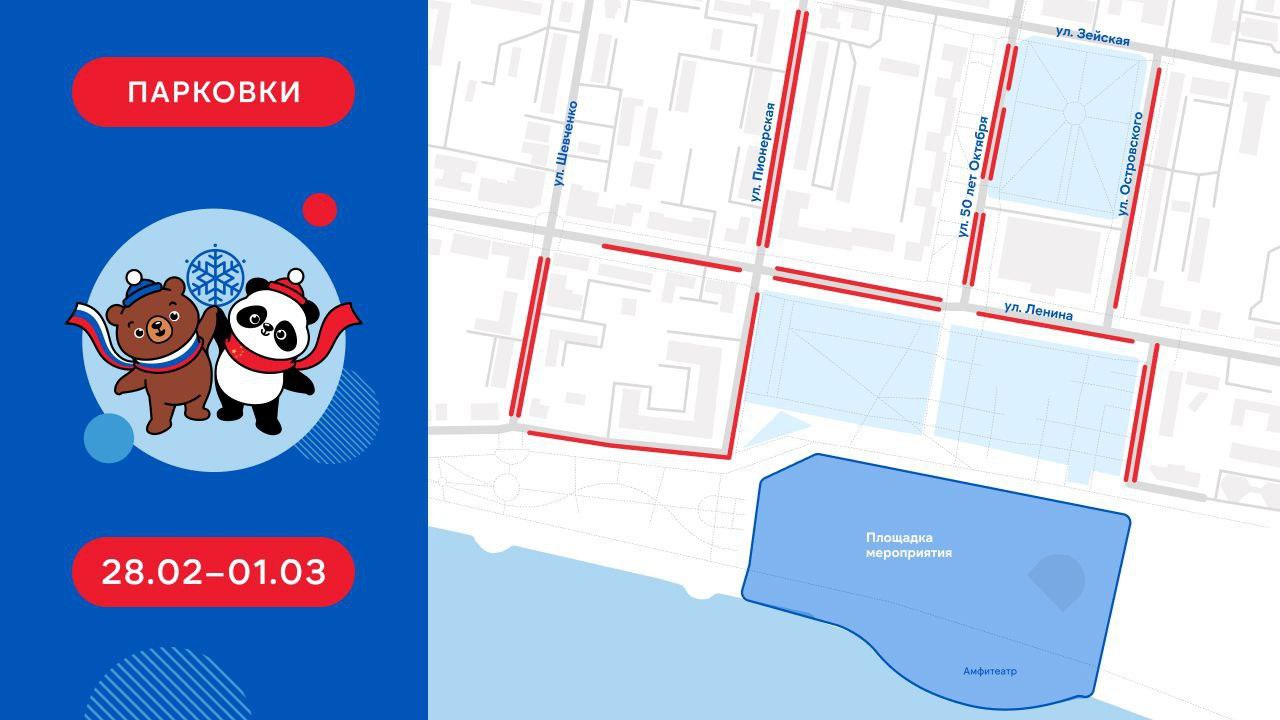 С 8:00 утра 28 февраля до 18:00 часов 1 марта — на улице Ленина от Шевченко до Шимановского (скорость до 20 км/ч).С 8:00 до 19:00 часов 28 февраля года и с 08:00 до 18:00 часов 1 марта — на улице Мухина от второго КТП ДВОКУ до набережной реки Амур...