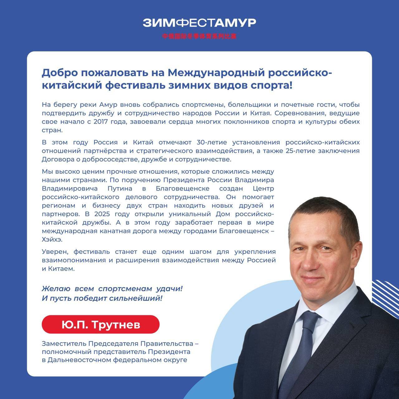 Слова приветствия участникам фестиваля направил заместитель Председателя Правительства Российской Федерации — полномочный представитель Президента РФ в Дальневосточном федеральном округе Юрий Трутнев.