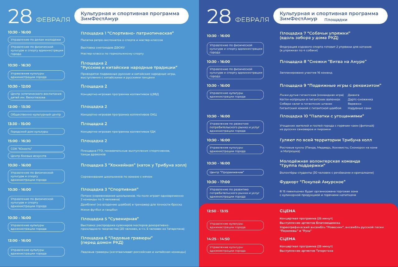 Площадки будут работать сегодня и завтра с 10:30 до 16 часов. Уже в 11:15 стартует торжественная церемония открытия Международного фестиваля #ЗимФестАмур. А вечером в 18:30 пройдут показательные вечерние заезды.