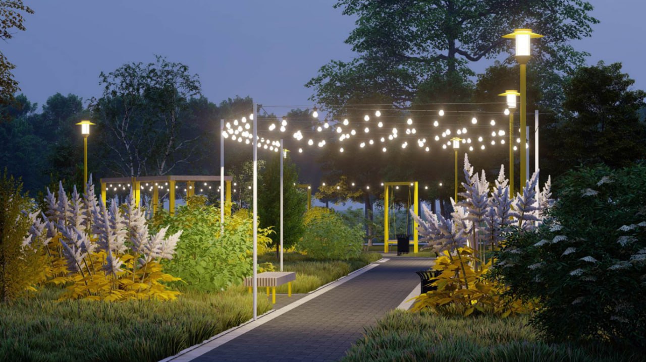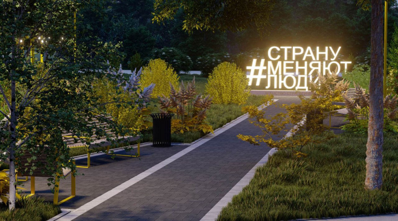 Здесь установят качели и скамейки в зонах тихого отдыха, смонтируют уличное освещение и декоративные гирлянды. Одним из визуальных акцентов станет световая конструкция #СтрануМеняютЛюди.