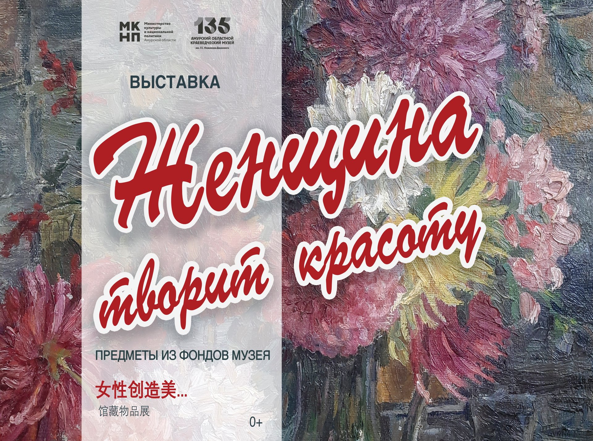 8 марта в здании Амурского областного краеведческого музея откроется выставка «Женщина творит красоту…» (0+). Посетителям представят около 200 разнообразных работ художниц и мастериц региона, выполненных в различных жанрах и техниках изобразительного и декоративно-прикладного творчества: живописи, графики, декоративной керамики, вязания, вышивки.