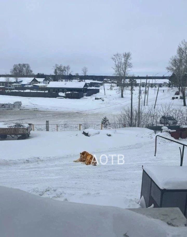 Между тем в социальных сетях также рассылают снимок, где тигр лежит посреди сельской местности. Авторы предполагают, что это то самое животное.