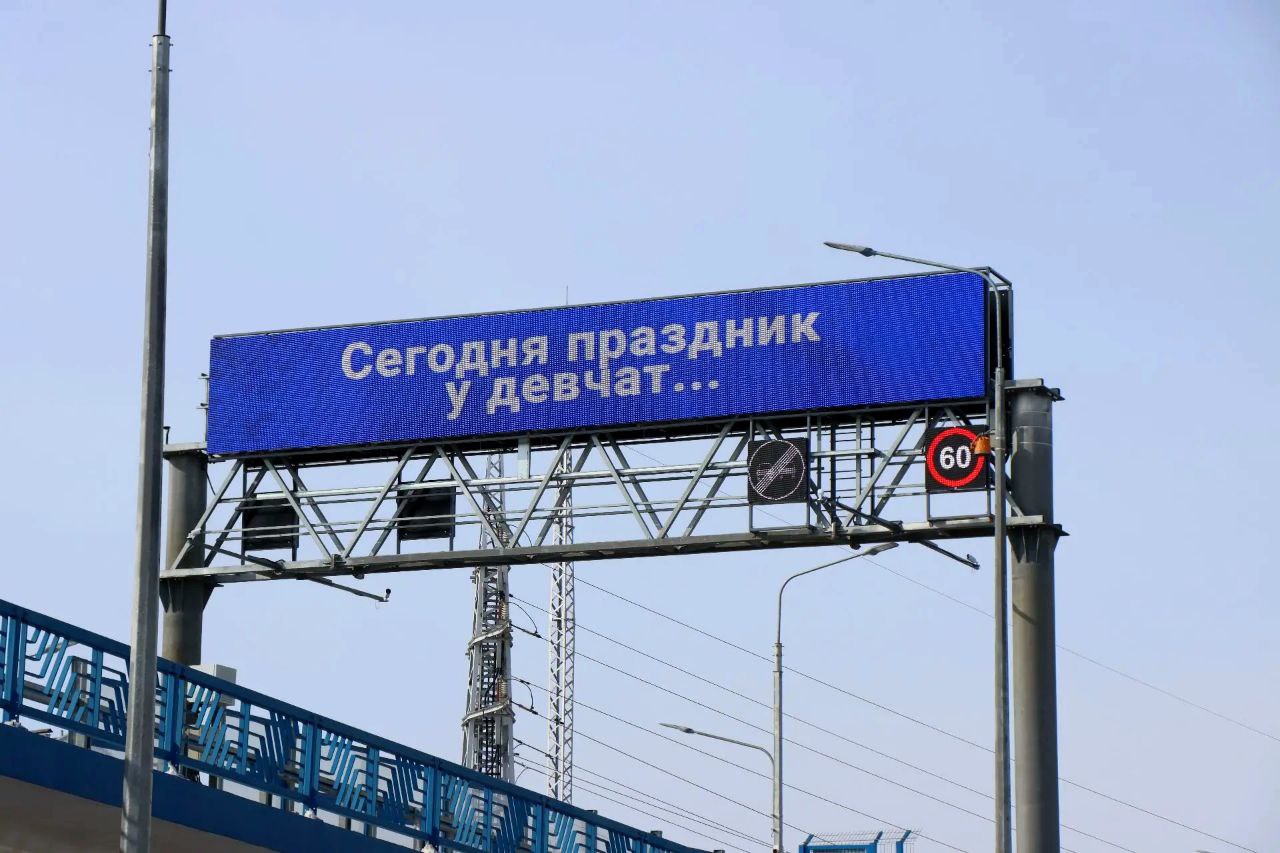 Сегодня его экраны транслируют поздравления для всех автоледи!