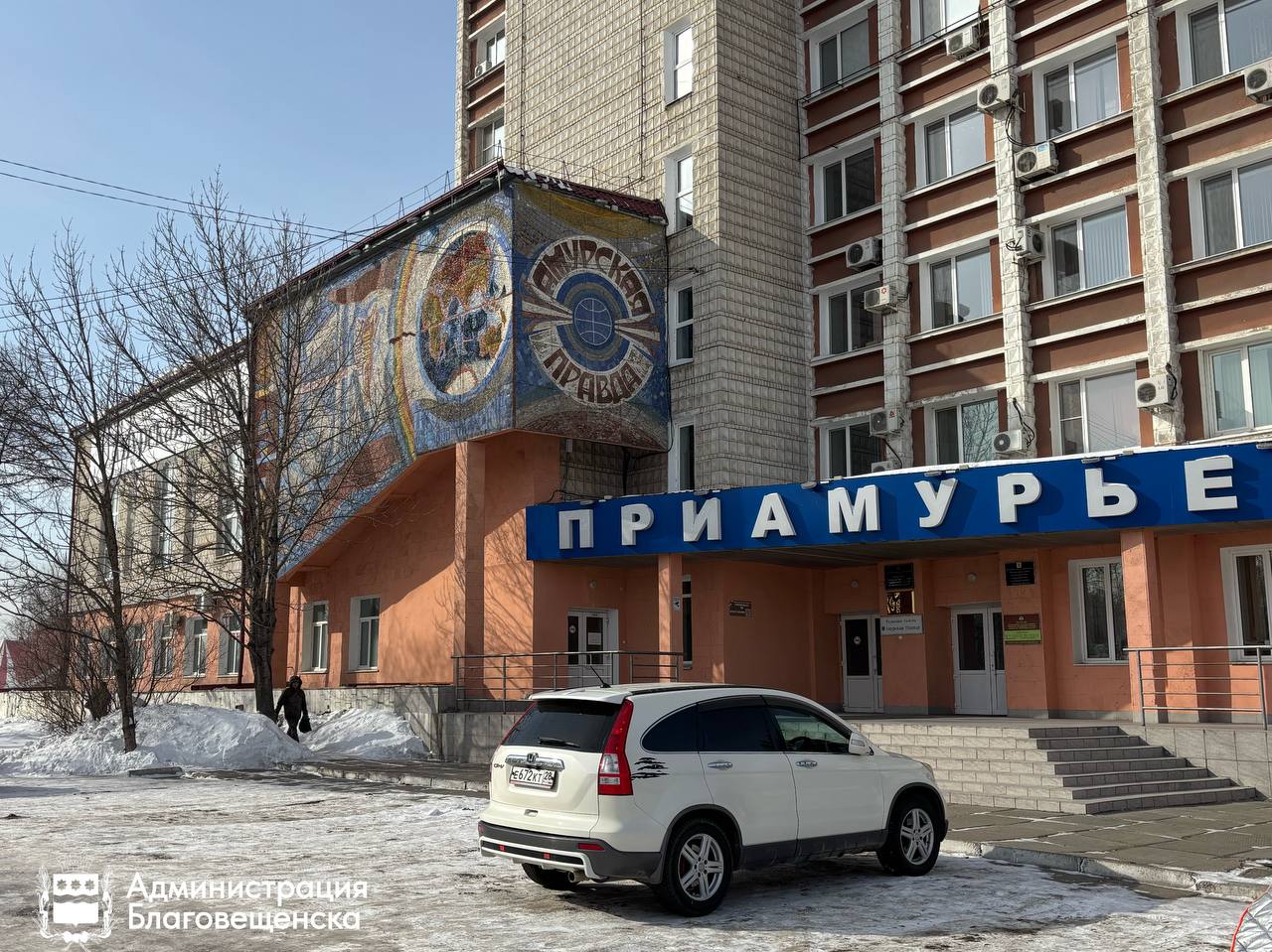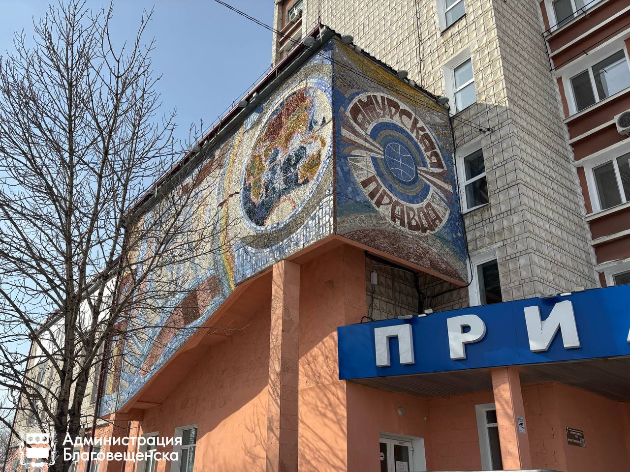 В 1986 году на здании появилось мозаичное панно работы народного художника России Александра Тихомирова. Композиция состоит из двух частей. На торце изображён земной шар с надписью «Амурская правда», а с другой стороны — земной шар, пронизанный радиосигналами в виде телеграфной ленты. Также на панно можно увидеть слияние двух рек — Амура и Зеи