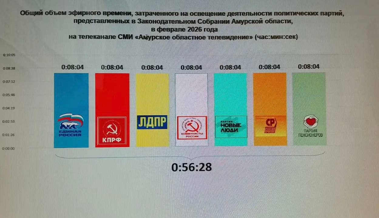 Установлено, что в феврале Амурское областное телевидение на освещение деятельности политических партий выделило 56 минут 28 секунд. Принято решение о соблюдении закона.