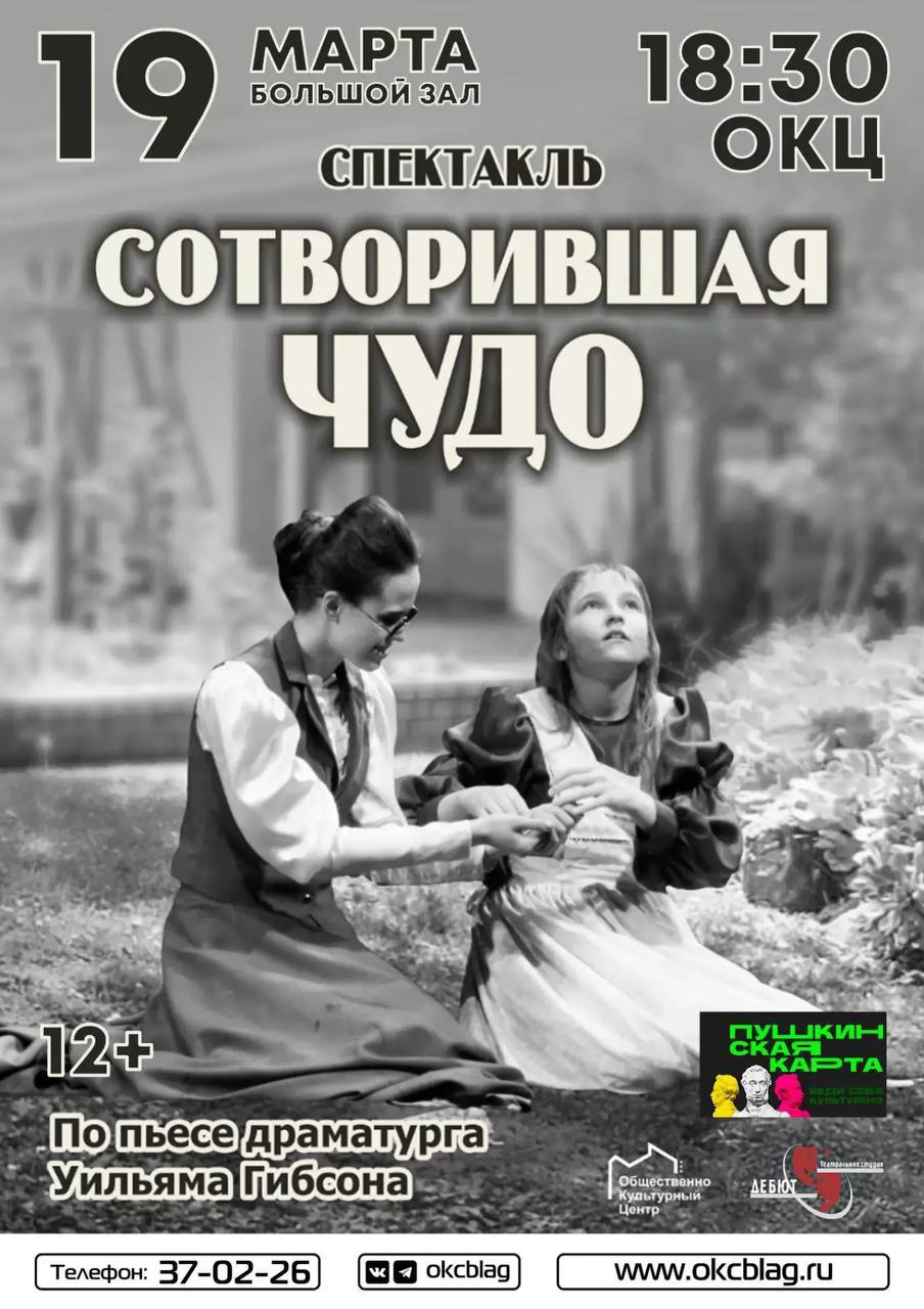 В розыгрыше вы можете выиграть 2 билета на 19 марта — спектакль «Сотворившая чудо» по пьесе драматурга Уильяма Гибсона.