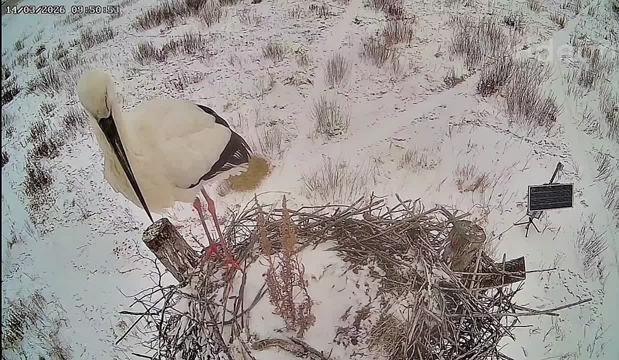 Утром 14 марта птица не стала терять времени и сразу занялась наведением порядка в жилище. За время отсутствия хозяина гнездо успели обжить непрошеные гости — вороны и зимняки.