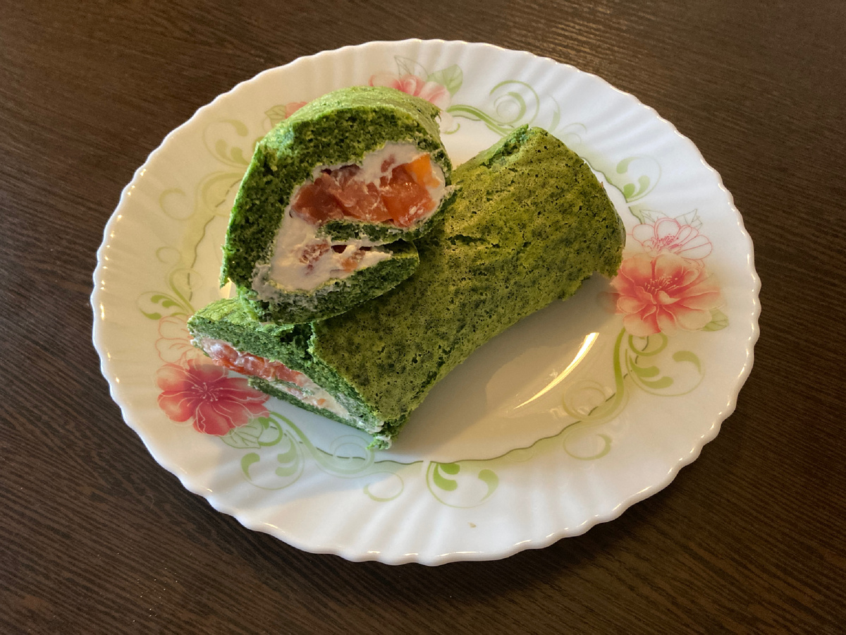 Готовый бисквит переворачиваем на доску и снимаем пергамент. Равномерно распределяем крем по всему тесту, после чего выкладываем кусочки рыбы. Плотно скручиваем в рулет. Если есть возможность, заверните рулет в пищевую плёнку и уберите в холодильник минимум на 4 часа, чтобы он хорошо настоялся.