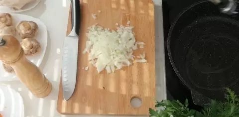 Первоначально необходимо нарезать лук и обжарить его на растительном масле до золотистого цвета. Пока он жарится, шампиньоны нарезаются кубиками и добавляются к луку. После обжаривания до полной прозрачности, грибы нужно остудить.