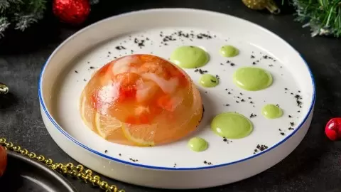 Холодец на основе свободного петуха, который хорошо застывает, раскрывает сложные мясные ароматы. В то время как рыбный бульон с крабом приближает его к высокой гастрономии.