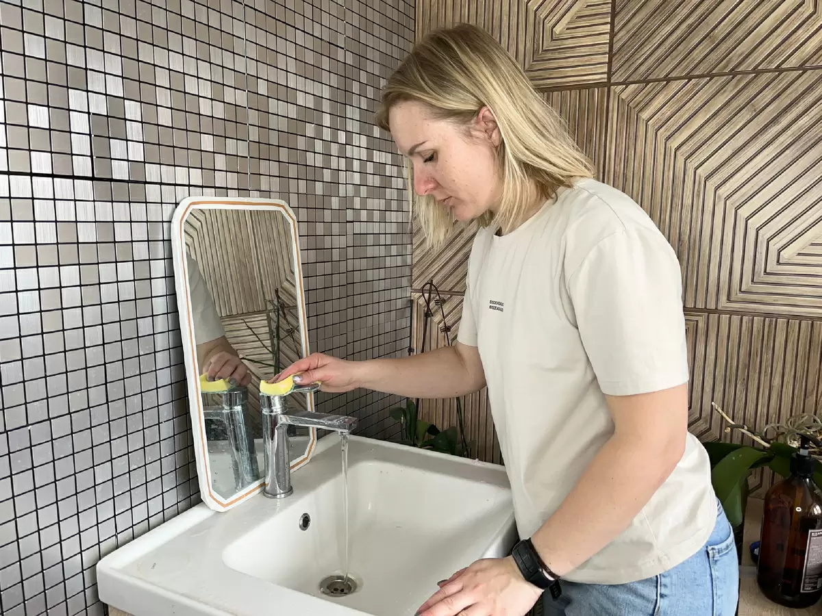 - Заботьтесь о сантехнике: Протирание крана и раковины специальным средством поможет предотвратить образование известкового налета. Это займет всего пару минут, но существенно упростит последующую уборку.