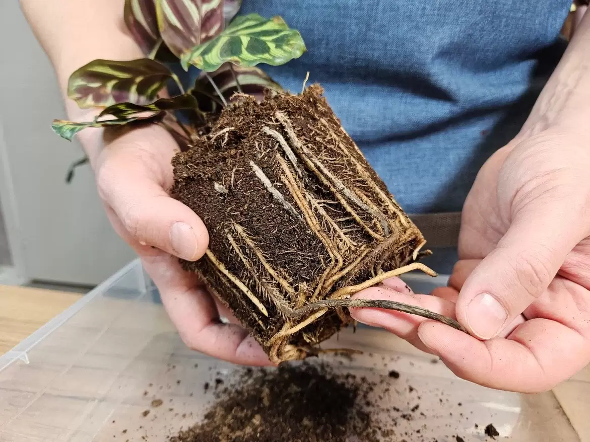 Увядание, пожелтение краёв листьев, появление пятен и общий упадок сил растения — это явные индикаторы, что корневая система требует внимания. Например, калатея, купленная со скидкой, может сигнализировать о наличии проблем: листья могут иметь сухие края и пятна. При извлечении растения из горшка может стать очевидным, что некоторые корни приобрели серый цвет и мягкую текстуру. Здоровые корни белые и упругие, тяжело рвутся при легком прикосновении.