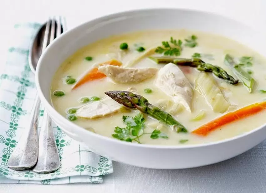 Основа — нежный бульон из курицы с добавлением лука, кореньев и ароматных трав. Важное место занимают сливки, которые становятся мягким каркасом для овощей и мяса, создавая густую, бархатистую текстуру.