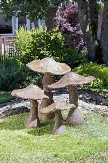 Для создания внешне правдоподобных грибов многие мастера выбирают цемент. Особый шарм придает им тщательно продуманная текстура: неровные шляпки и разноцветные пятна делают эти фигуры похожими на настоящие лесные грибы. Также популярностью пользуются керамические изделия, которые с лёгкостью дополняют садовый пейзаж. Их можно использовать в качестве акцентов в цветниках или просто расставить по газону.