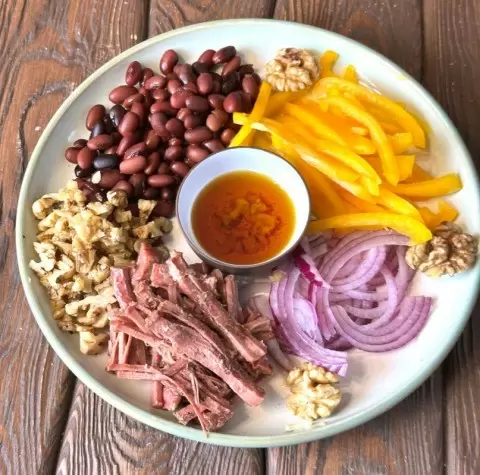 С самого первого раза он стал незаменимым, его просят готовить всё чаще. В чем же его секрет? В идеальном балансе: насыщенная говядина, сладкий болгарский перец, хрустящие орехи и нежная пикантность заправки создают настоящий праздник для вкуса.