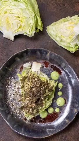 Этот салат — настоящий праздник свежести и легкости, который идеально сочетает в себе различные текстуры и вкусы. Представьте себе салат айсберг, сверху которого щедро положен нежный соус из маскарпоне с добавлением свежей зелени, а также посыпка из измельчённого сушеного тунца, кунжута и водорослей нори. Это блюдо станет настоящей находкой для любителей здорового питания!
