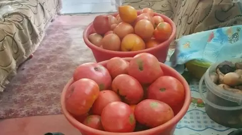 - Батяня: Сердцевидные, розовые томаты весом 300-450 г, урожай до 6,8 кг с куста.