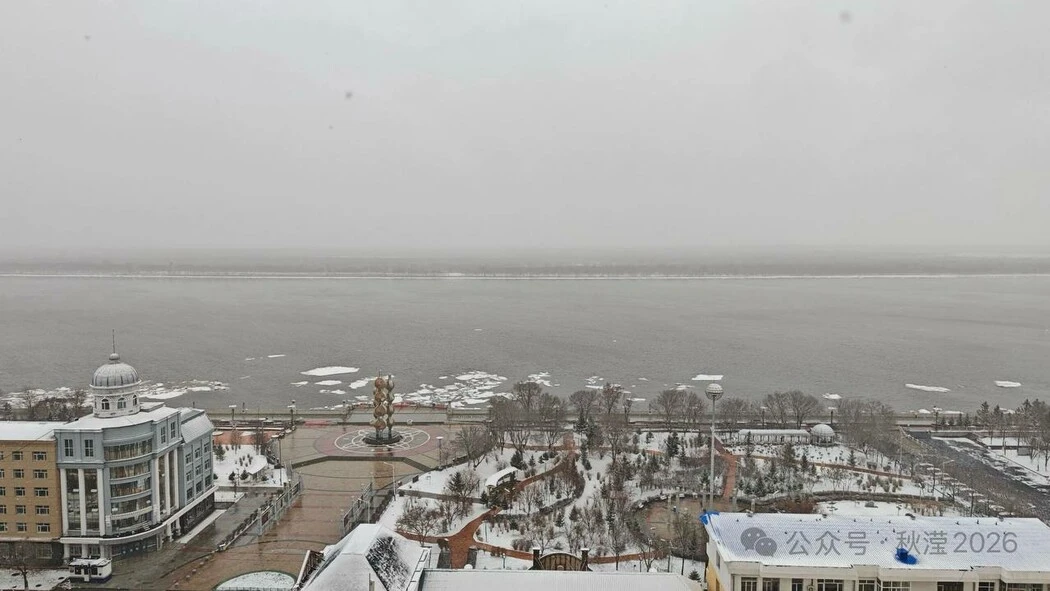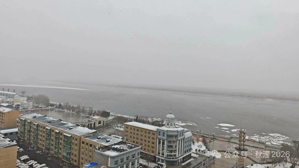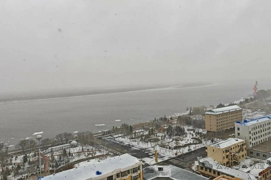 Жители китайского уезда Сюнькэ сфотографировали из окна многоэтажки российскую сторону Амура. Фото было сделано во время снегопада.