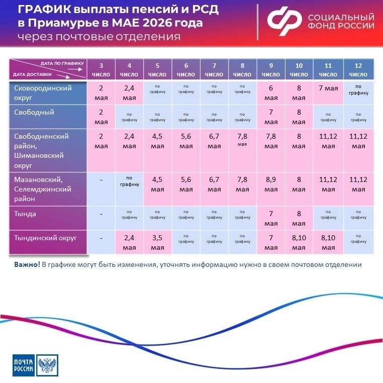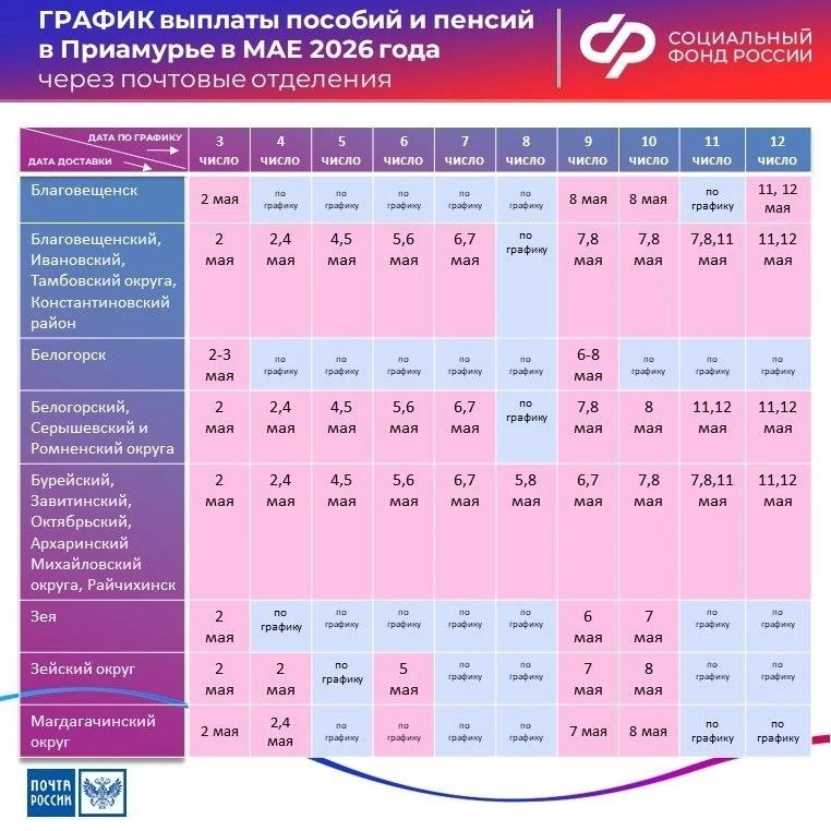 Досрочное перечисление средств коснется тех, кому деньги зачисляют через банк. Почтовые отделения доставят выплаты по обычному графику, сообщили в пресс-службе СоцФонда по Амурской области.