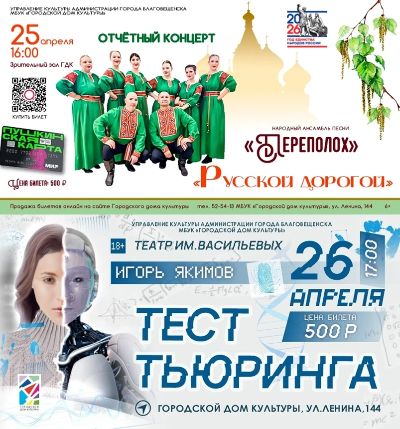 Первый победитель получит два билета на отчетный концерт народной вокальной группы «Переполох», который пройдет 25 апреля в 16:00. Второй победитель получит два билета на спектакль народного театра имени Васильевых «Тест Тьюринга», который пройдет 26 апреля в 17:00.